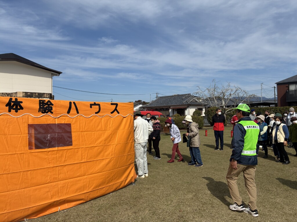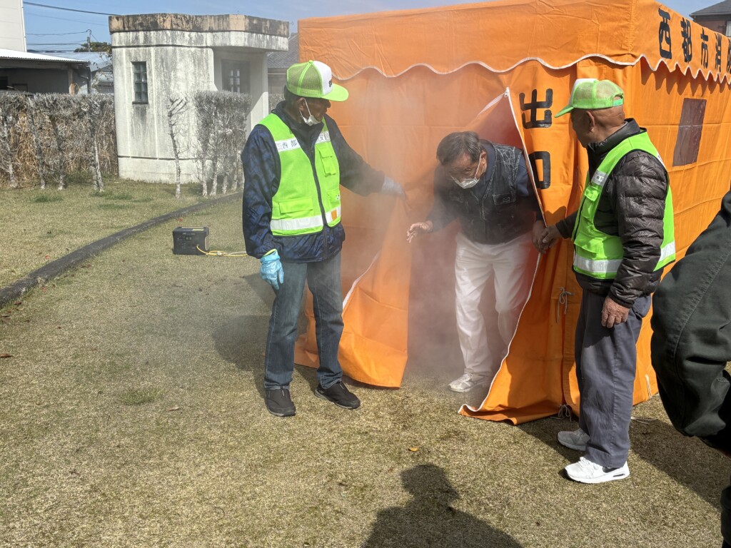 開会式終了後、西都市消防署が用意してくれた、煙体験ハウスを全員体験してもらいました。