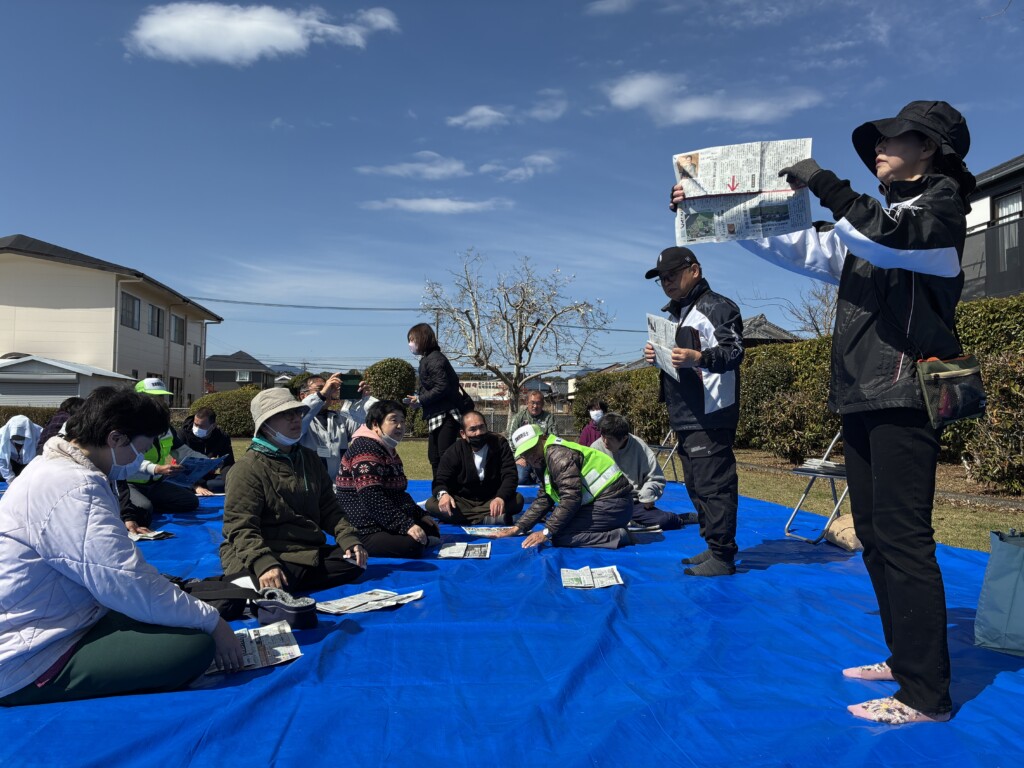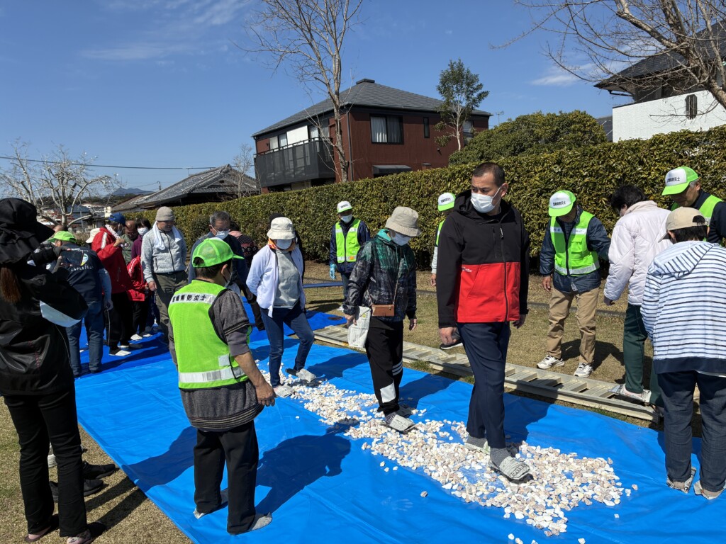筌瀬明美支部長から避難所での過ごし方のを講話を聞きその後、全員で新聞紙でスリッパを作り、用意した石ころの上を歩いてもらい簡易スリッパの体験をしてもらいました。