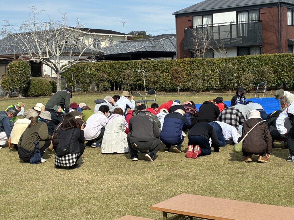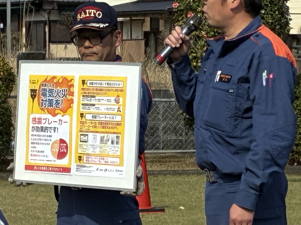 筌瀬支部長の挨拶の後、第9集会所の黒木史也公民館長に挨拶していただき、参加者全員のシェイクアウトの訓練をしました。最後に西都市消防署の方の自己紹介の後、感震ブレイカーの大切さのお話をして頂きました。
