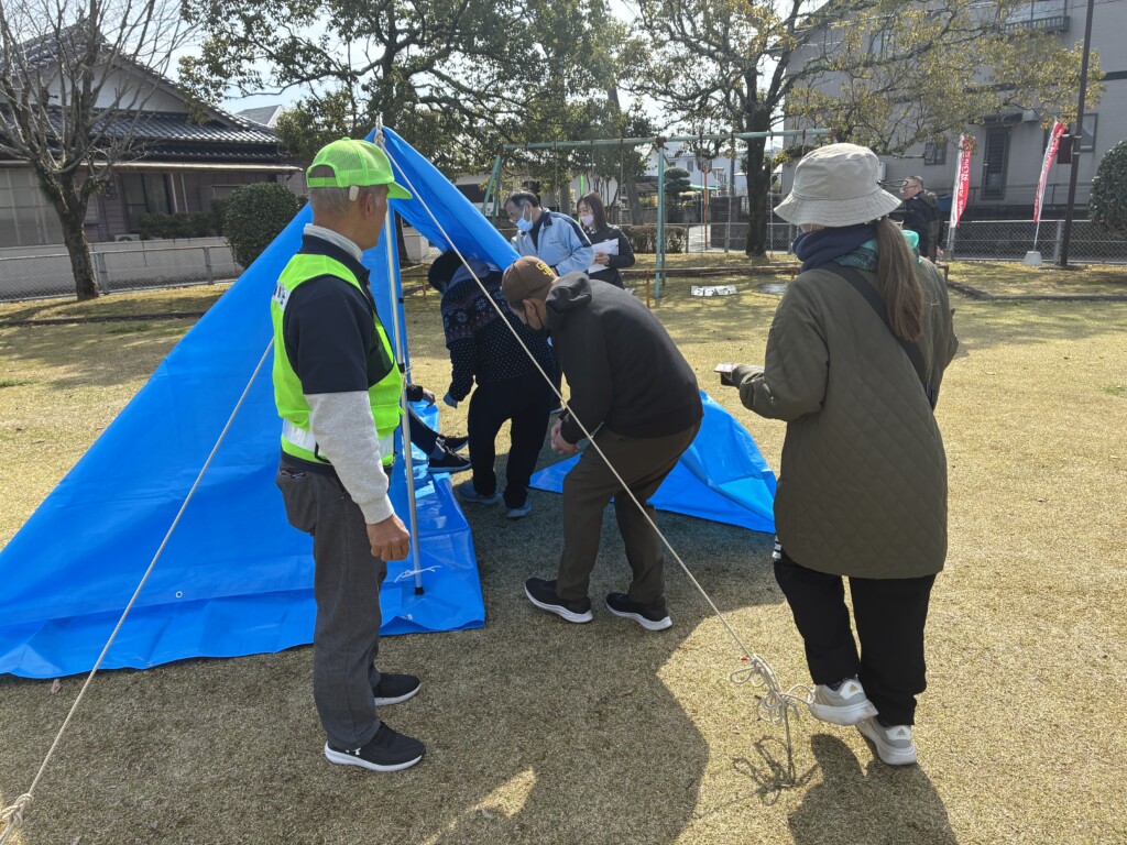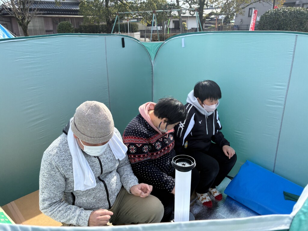 間仕切りパーテーションとブルーシート3枚で作った簡易テントの中に入ってもらい体感してもらいました。