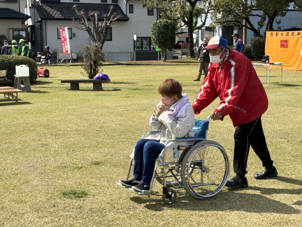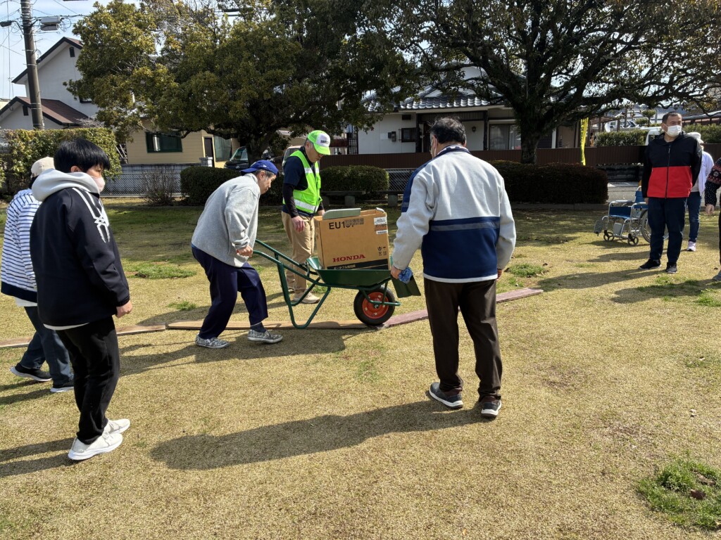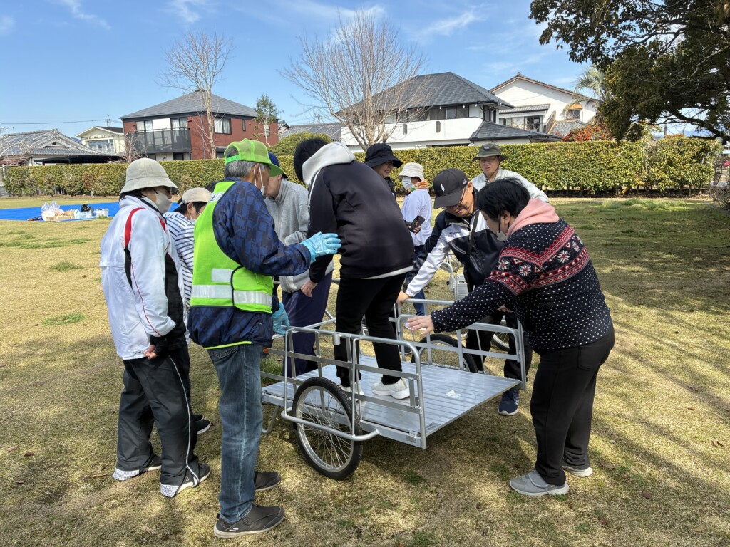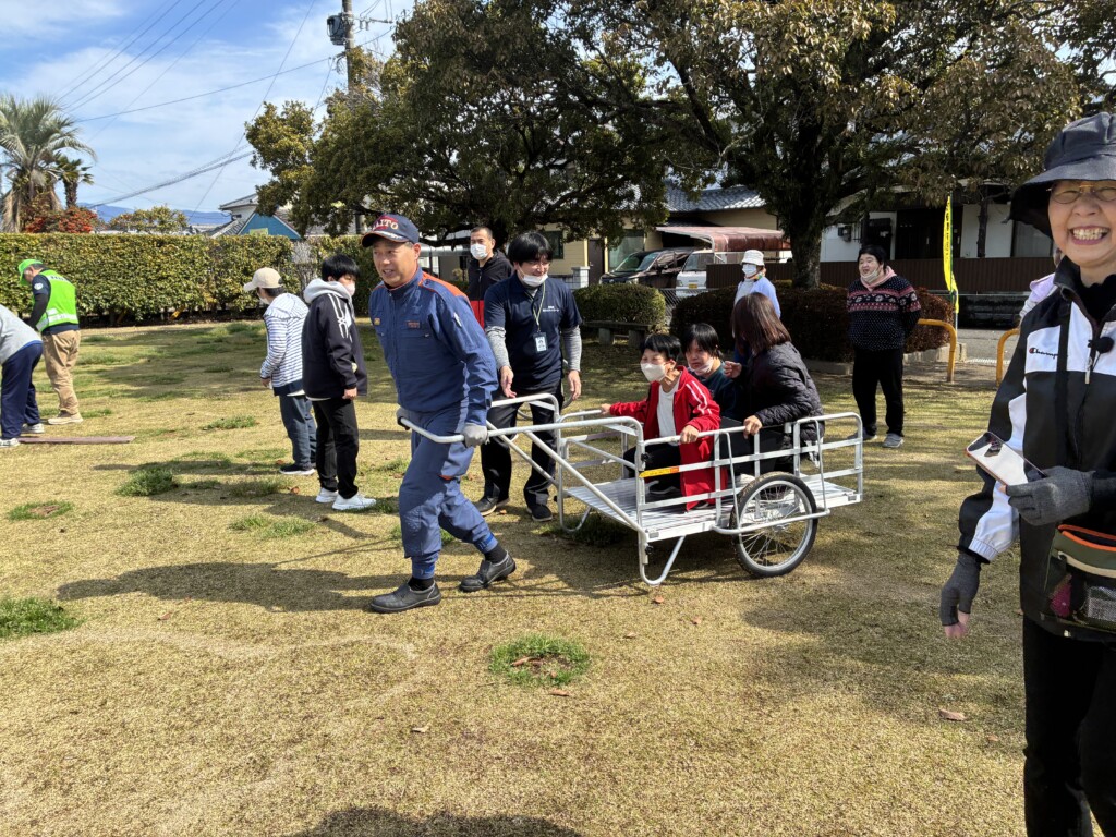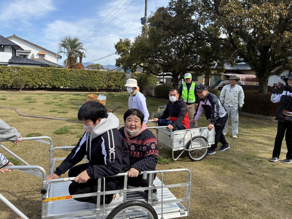 リヤカーに人を乗せての搬送と車いすでの搬送体験。リヤカーは乗り降りがちゃんと固定していないと危ないので注意が必要です。