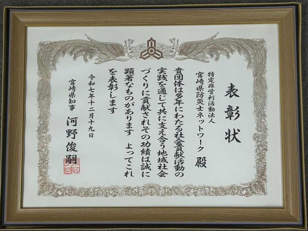 宮崎県防災士ネットワークのこれまでの活動が評価され、この度「みやざき社会貢献活動」の表彰を受けました。