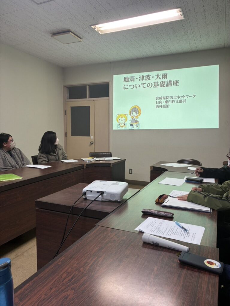 日向・東臼杵支部2月度定例会 事務局 X Facebook はてブ LINE コピー 2026.02.15 2月10日(火)、日向市消防署内で2月度の定例会を行いました。 内容は、地震・津波・大雨の防災基礎講座の後、県の理事会・委託事業説明会の報告と今後の活動予定の確認が主でした。