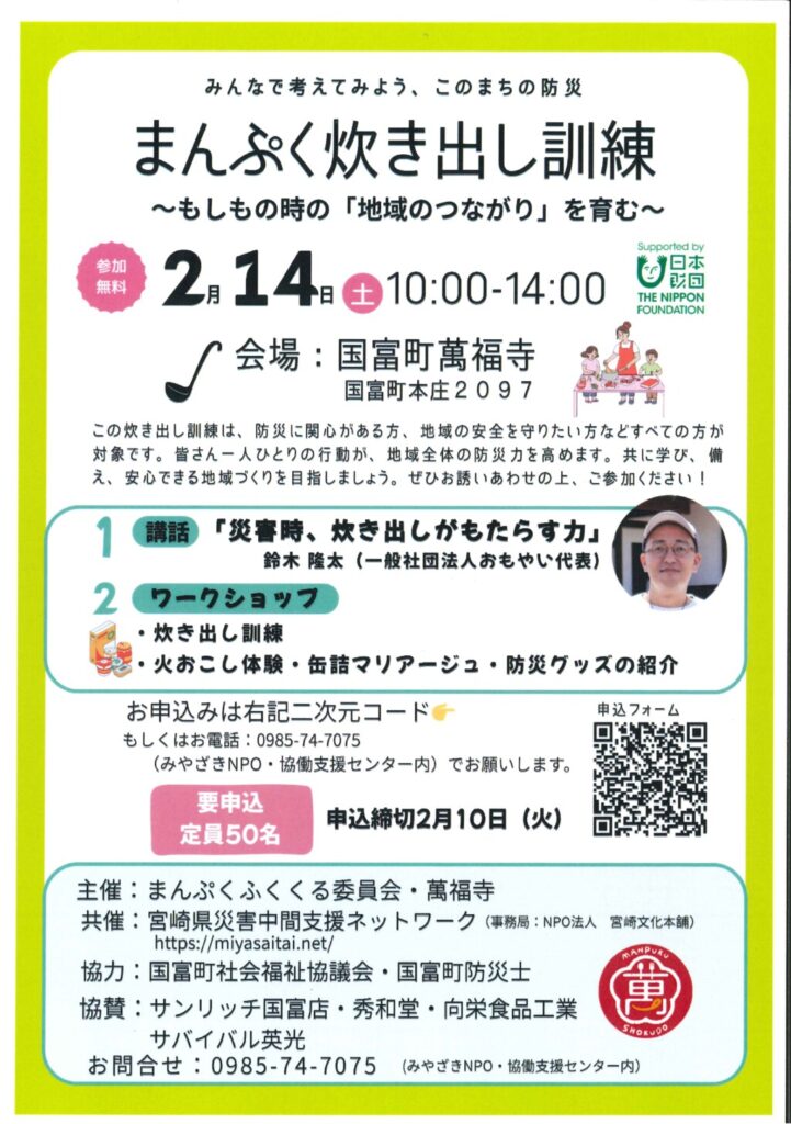 炊き出し訓練のご案内 一般 X Facebook はてブ LINE コピー 2026.02.05 目次 まんぷく炊き出し訓練~もしもの時の「地域のつながり」を育む~2026年2月14日(土)10:00~14:00国富町萬福寺(国富町本庄2097)主な内容1.講話「災害時、炊き出しがもたらす力」by鈴木隆太(一般社団法人おもやい代表)2.ワークショップ・炊き出し訓練・火おこし体験・缶詰マリアージュ・防災グッズの紹介 まんぷく炊き出し訓練~もしもの時の「地域のつながり」を育む~ 2026年2月14日(土)10:00~14:00 国富町萬福寺(国富町本庄2097) 主な内容 1.講話「災害時、炊き出しがもたらす力」by鈴木隆太(一般社団法人おもやい代表) 2.ワークショップ・炊き出し訓練・火おこし体験・缶詰マリアージュ・防災グッズの紹介