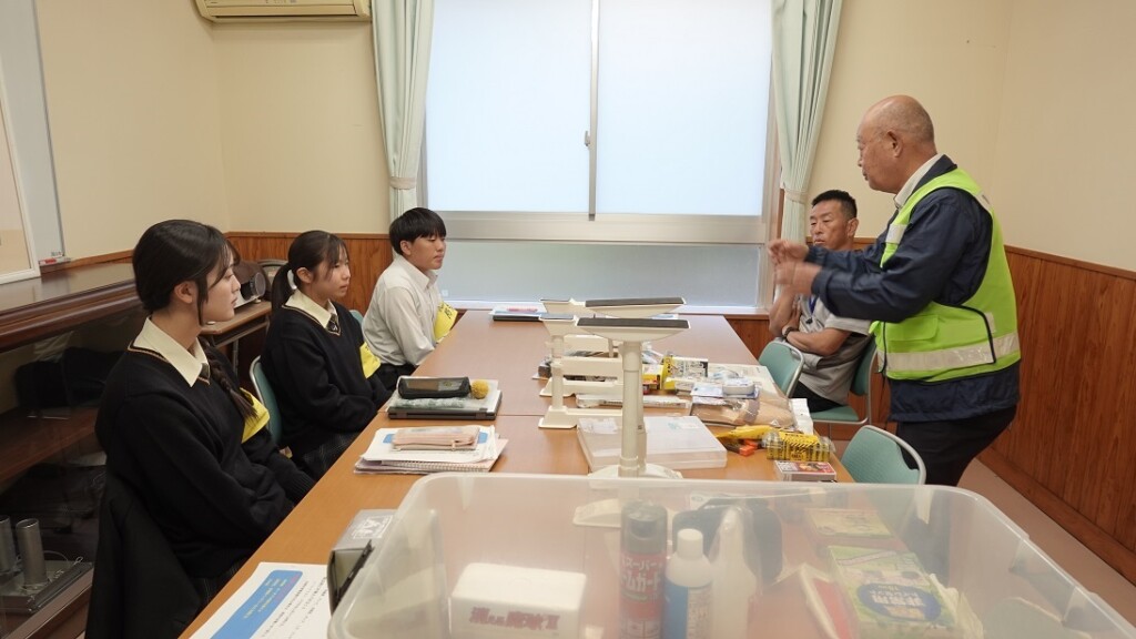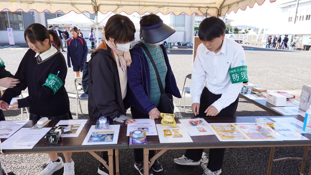 10月29日に1時間の事前研修を行った甲斐もあって、3人の新米高校生防災士は「高城高校 防災士」の腕章をして、訪れた人たちへ使い方や購入方法などをしっかりと説明していました。